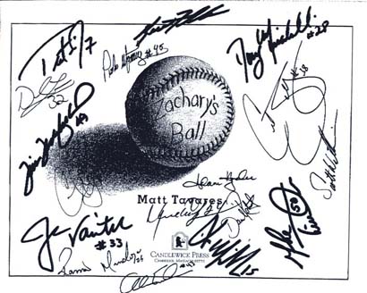 2000 Oppenheim Toy Portfolio Gold Seal Award Winner 2000 Massachusetts Book Award, Honor Book 2000 Boston Authors Club, Runner-Up One of Yankee Magazine's 40 Classic New England Children's Books ![]() How cool is this! A collector's edition of ZACHARY'S BALL, signed by 19 members of the 2004 World Series Champion Boston Red Sox, was auctioned on eBay to benefit First Book, a great organization that provides books for low income families. The auction raised $1,950 to provide books to Boston-area children in need. Here is a picture of the signed page: |